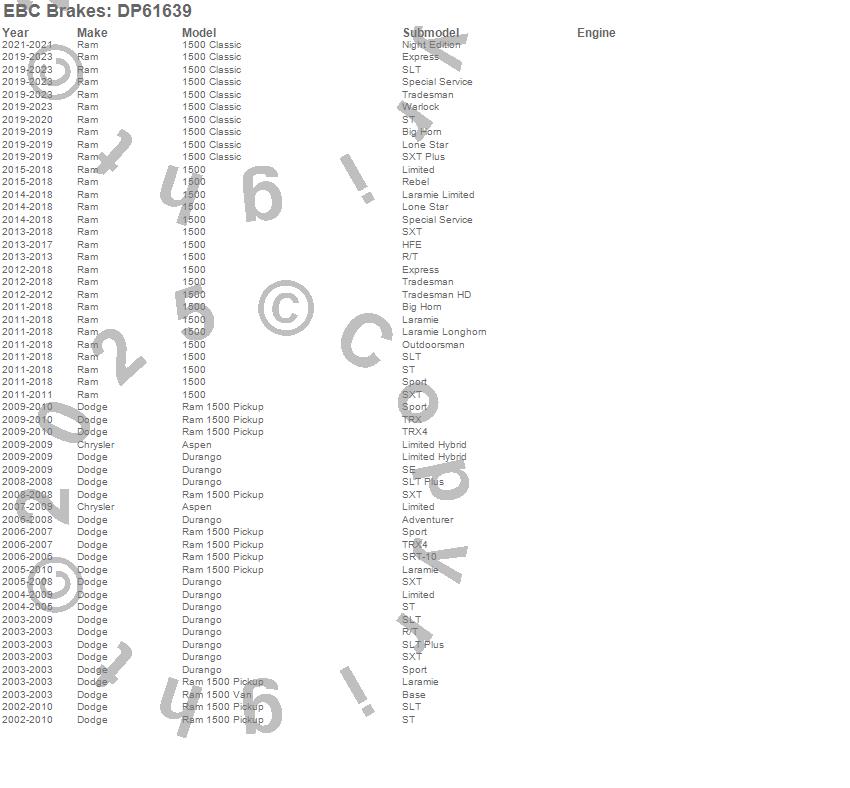 Below is an abreviated list of applications for the EBC 6000 Series Greenstuff Truck/SUV Brakes Disc Pads.