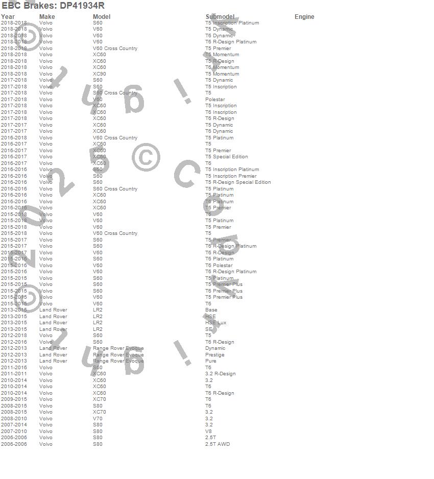 Below is an abreviated list of applications for the Yellowstuff Street And Track Brake Pads. LR2, Range Rover Evoque, S60, S80, V60, V60 Cross Country, V70, XC60, XC70, Land Rover, Volvo, 2015, 2014, 2013, 2012, 2011, 2010, 2009, 2008, 2007 more…