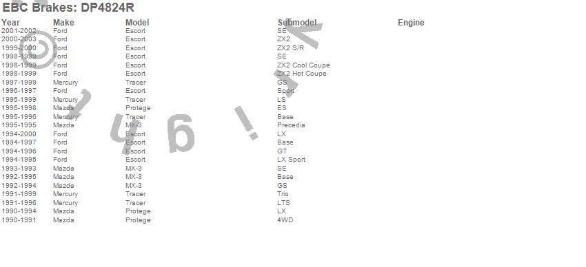 Below is an abreviated list of applications for the Yellowstuff Street And Track Brake Pads. Escort, MX-3, Protege, Tracer, Ford, Mazda, Mercury, 2003, 2002, 2001, 2000, 1999, 1998, 1997, 1996, 1995, 1994, 1993, 1992, 1991 more…
