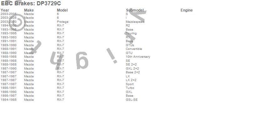 Below is an abreviated list of applications for the EBC Redstuff Ceramic Low Dust Brake Pads. 6, Protege, RX-7, Mazda, 2005, 2004, 2003, 1995, 1994, 1993, 1991, 1990, 1989, 1988, 1987, 1986, 1985, 1984 more…