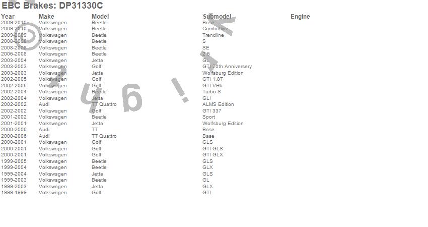 Below is an abreviated list of applications for the EBC Redstuff Ceramic Low Dust Brake Pads. Beetle, Golf, Jetta, TT, TT Quattro, Audi, Volkswagen, 2010, 2009, 2008, 2007, 2006, 2005, 2004, 2003, 2002, 2001, 2000, 1999 more…