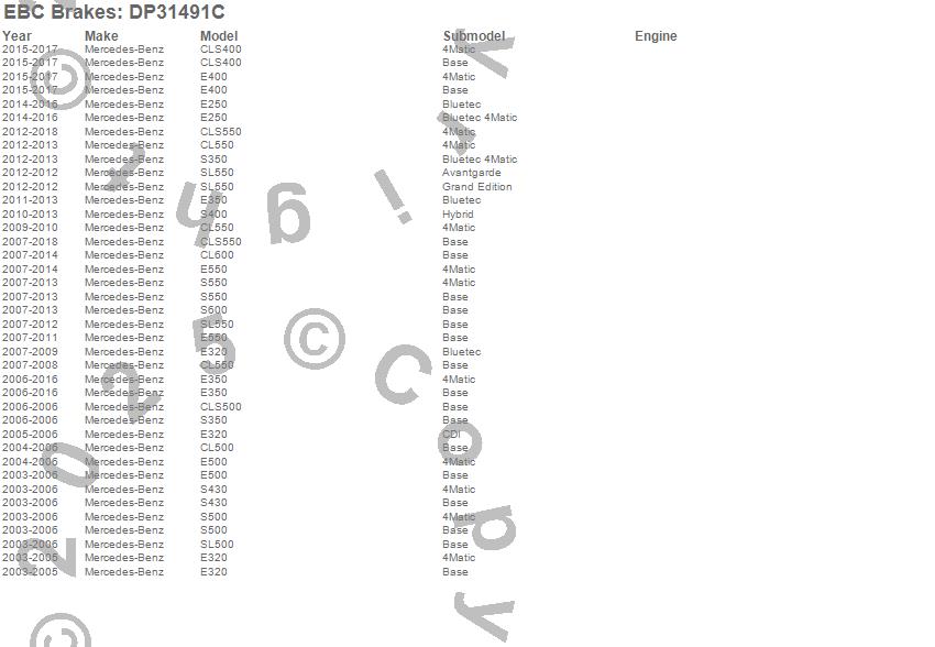 Below is an abreviated list of applications for the EBC Redstuff Ceramic Low Dust Brake Pads. CL500, CL550, CL600, CLS500, CLS550, E250, E320, E350, E400, E500, E550, S350, S400, S430, S500, S550, S600, SL500, SL550, Mercedes-Benz more...