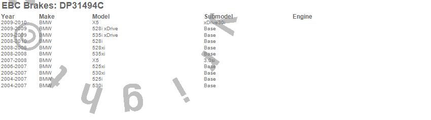Below is an abreviated list of applications for the EBC Redstuff Ceramic Low Dust Brake Pads. 525i, 525xi, 528i, 528i xDrive, 528xi, 530i, 530xi, 535i xDrive, 535xi, X5, BMW, 2010, 2009, 2008, 2007, 2006, 2005, 2004 more...