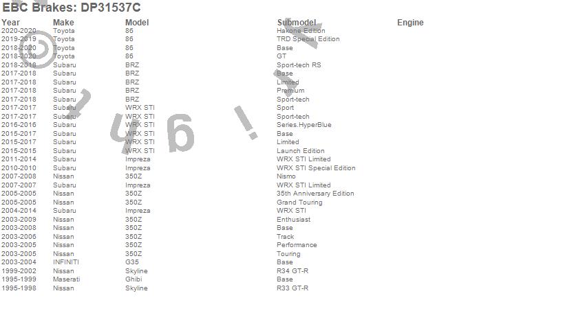 Below is an abreviated list of applications for the EBC Redstuff Ceramic Low Dust Brake Pads. 350Z, G35, Ghibi, Impreza, Skyline, Infiniti, Maserati, Nissan, Subaru, 2014, 2013, 2012, 2011, 2010, 2009, 2008, 2007, 2006, 2005, 2004 more…