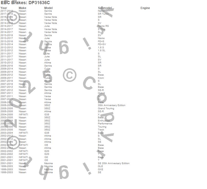 Below is an abreviated list of applications for the EBC Redstuff Ceramic Low Dust Brake Pads. 350Z, Altima, Cube, G20, G35, I30, I35, Juke, Maxima, Sentra, Versa, Infiniti, Nissan, 2013, 2012, 2011, 2010, 2009, 2008, 2007 more...