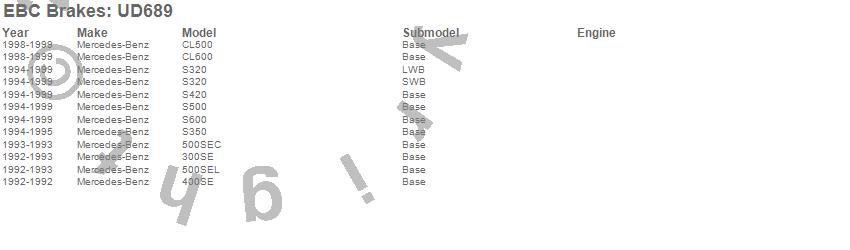 Below is an abreviated list of applications for the EBC Ultimax OEM Replacement Brake Pads. 300SE, 400SE, 500SEC, 500SEL, CL500, CL600, S320, S350, S420, S500, S600, Mercedes-Benz, 1999, 1998, 1997, 1996, 1995, 1994, 1993, 1992 more…