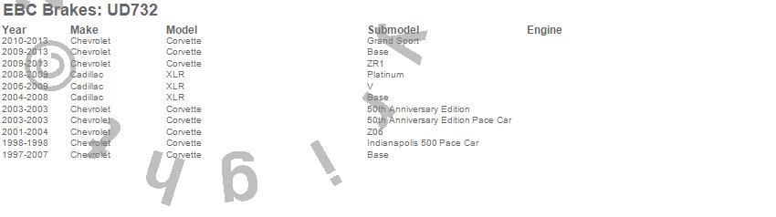 Below is an abreviated list of applications for the EBC Ultimax OEM Replacement Brake Pads. Corvette, XLR, Cadillac, Chevrolet, 2013, 2012, 2011, 2010, 2009, 2008, 2007, 2006, 2005, 2004, 2003, 2002, 2001, 2000, 1999, 1998 more…