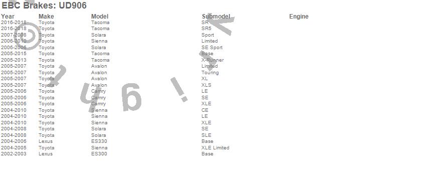 Below is an abreviated list of applications for the EBC Ultimax OEM Replacement Brake Pads. Avalon, Camry, ES300, ES330, Sienna, Solara, Tacoma, Lexus, Toyota, 2013, 2012, 2011, 2010, 2009, 2008, 2007, 2006, 2005, 2004, 2003 more…