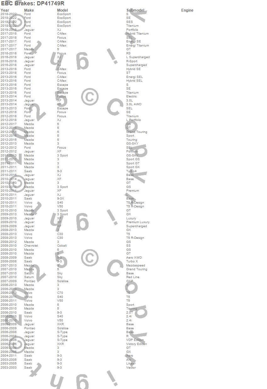 Below is an abreviated list of applications for the Yellowstuff Street And Track Brake Pads. 3, 3 Sport, 5, 9-3, 9-3X, C-Max, C30, C70, Cobalt, Escape, Focus, S-Type, S40, Sky, Solstice, V50, XF, XJ, XKR, Chevrolet more…