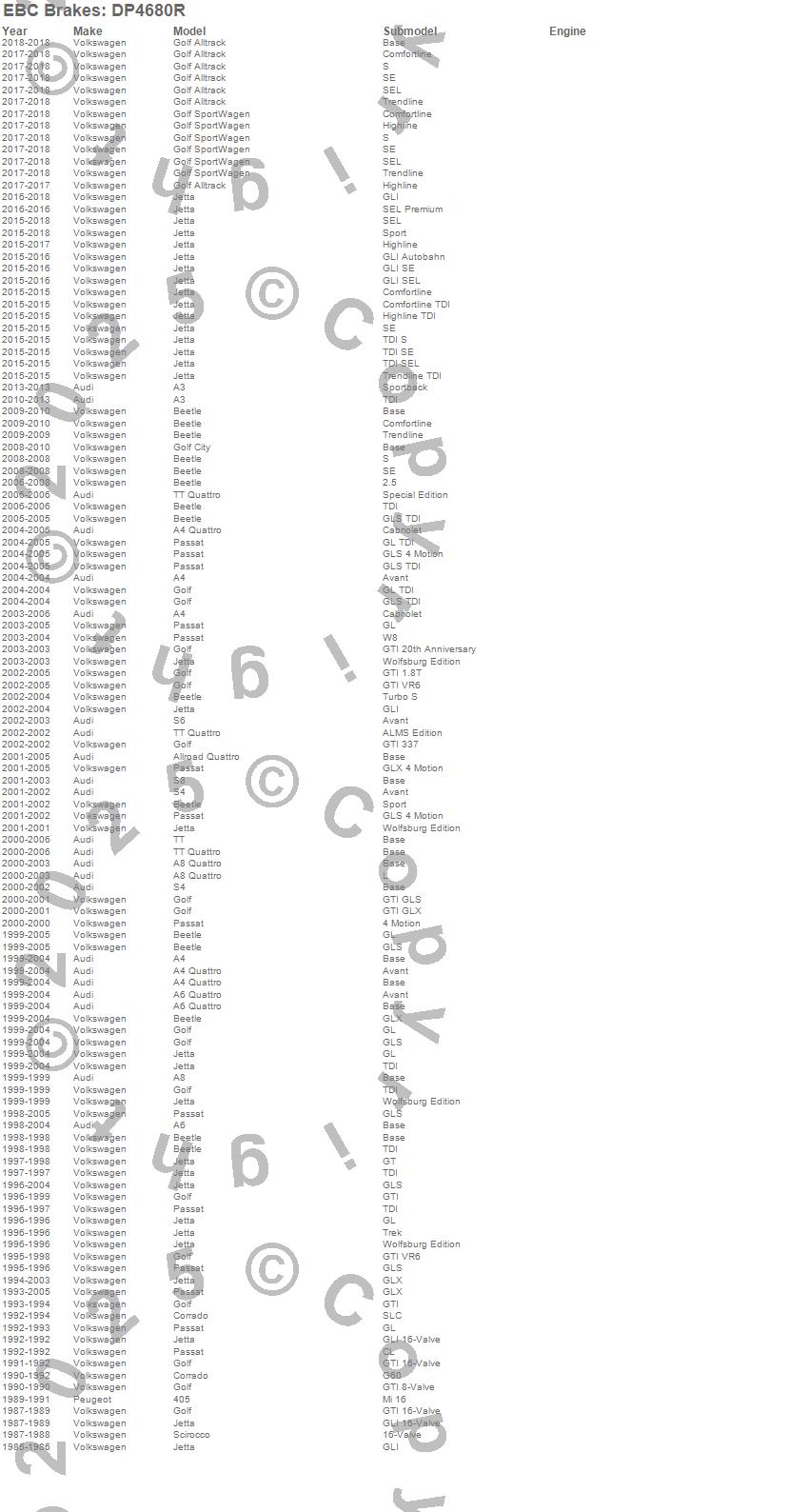 Below is an abreviated list of applications for the Yellowstuff Street And Track Brake Pads. A3, A4, A4 Quattro, A6, A6 Quattro, A8, A8 Quattro, Allroad Quattro, Beetle, Corrado, Golf, Golf City, Jetta, Passat, R32, S4, S6, S8, TT, TT Quattro more…