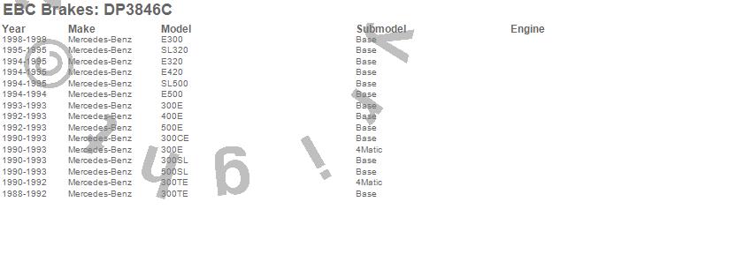 Below is an abreviated list of applications for the EBC Redstuff Ceramic Low Dust Brake Pads. 300CE, 300E, 300SL, 300TE, 400E, 500E, 500SL, E300, E320, E420, E500, SL320, SL500, Mercedes-Benz, 1999, 1998, 1995, 1994, 1993, 1992 more…