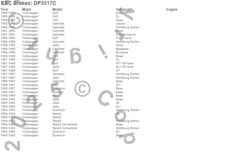 Below is an abreviated list of applications for the EBC Redstuff Ceramic Low Dust Brake Pads. Cabriolet, Golf, Jetta, Quantum, Rabbit, Rabbit Convertible, Scirocco, Volkswagen, 1993, 1992, 1991, 1990, 1989, 1988, 1987, 1986, 1985, 1984, 1983 more…