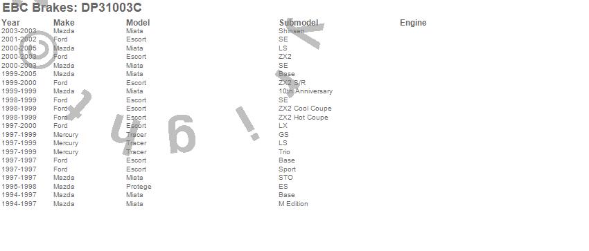 Below is an abreviated list of applications for the EBC Redstuff Ceramic Low Dust Brake Pads. Escort, Miata, Protege, Tracer, Ford, Mazda, Mercury, 2005, 2004, 2003, 2002, 2001, 2000, 1999, 1998, 1997, 1996, 1995, 1994 more...