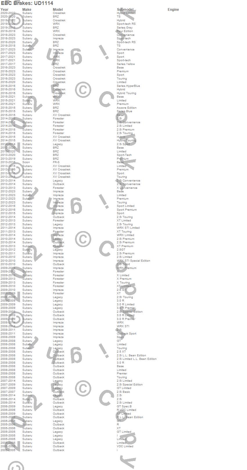 Below is an abreviated list of applications for the EBC Ultimax OEM Replacement Brake Pads. BRZ, Forester, Impreza, Legacy, Outback, XV Crosstrek, Subaru, 2015, 2014, 2013, 2012, 2011, 2010, 2009, 2008, 2007, 2006, 2005 more…