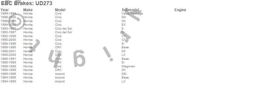 Below is an abreviated list of applications for the EBC Ultimax OEM Replacement Brake Pads. Accord, Civic, Civic del Sol, CRX, Honda, 2001, 2000, 1999, 1998, 1997, 1996, 1995, 1994, 1993, 1992, 1991, 1990, 1989, 1988, 1985 more…