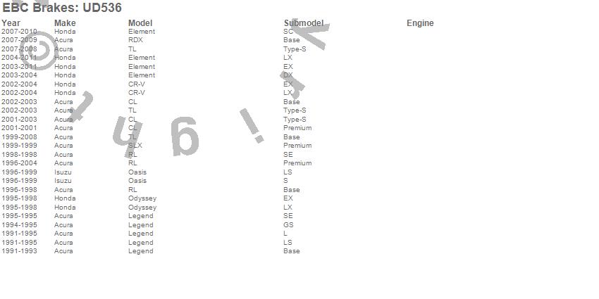 Below is an abreviated list of applications for the EBC Ultimax OEM Replacement Brake Pads. CL, CR-V, Element, Legend, Oasis, Odyssey, RDX, RL, SLX, TL, Acura, Honda, Isuzu, 2011, 2010, 2009, 2008, 2007, 2006, 2005 more…