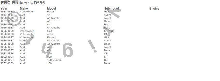Below is an abreviated list of applications for the EBC Ultimax OEM Replacement Brake Pads. 100, 100 Quattro, A4, A4 Quattro, A6, A6 Quattro, A8, Golf, Jetta, Passat, Audi, Volkswagen, 1999, 1998, 1997, 1996, 1995, 1994, 1993, 1992 more…