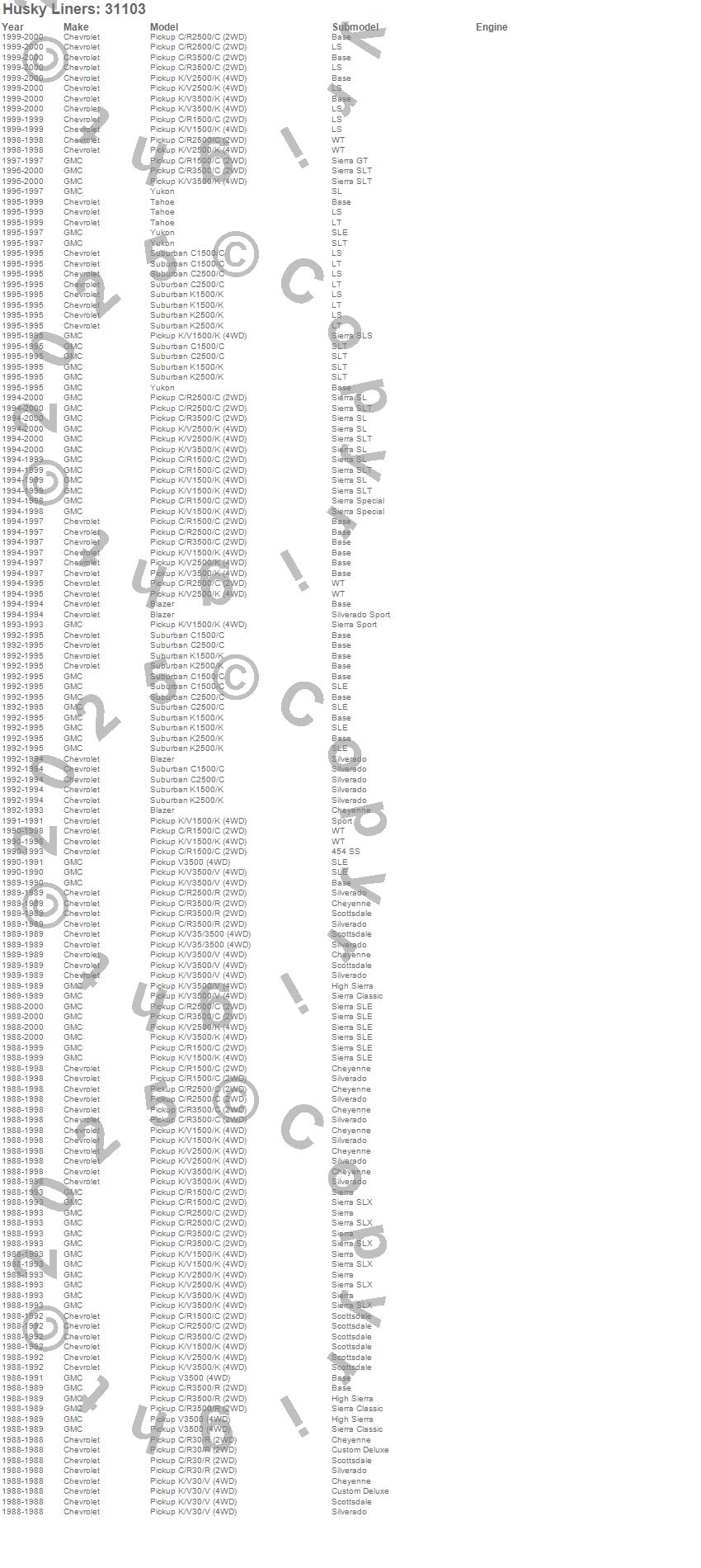 Below is an abreviated list of applications for the Classic Style Floor Liner.