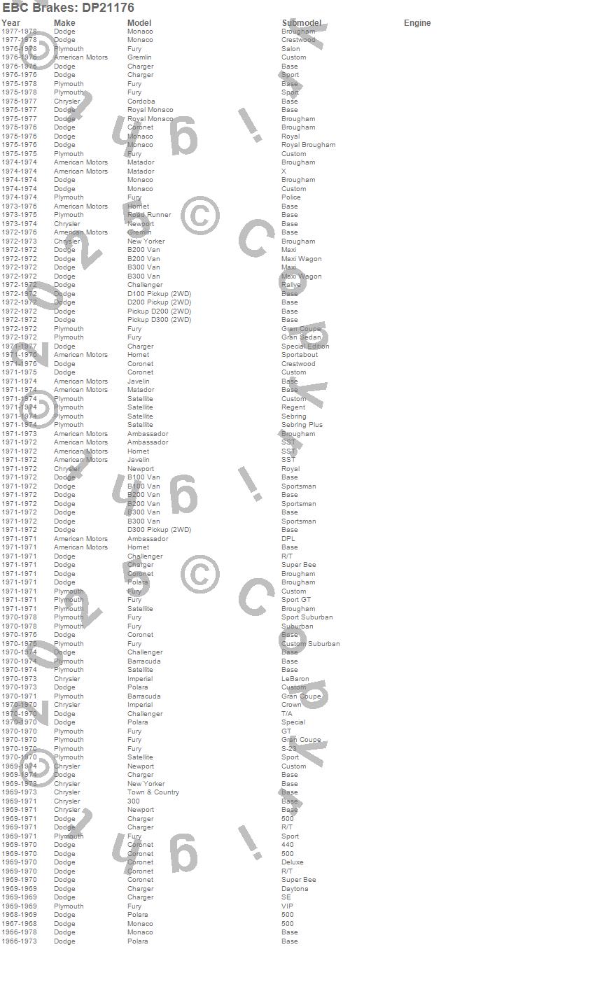300, Ambassador, B100 Van, B200 Van, B300 Van, Barracuda, Challenger, Charger, Cordoba, Coronet, D100 Pickup, D200 Pickup, D300 Pickup, Fury, Gremlin, Hornet, Imperial, Javelin, Matador, Monaco more...