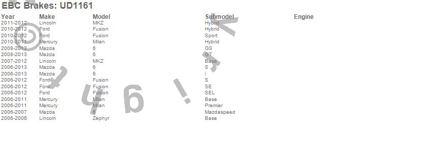 Below is an abreviated list of applications for the EBC Ultimax OEM Replacement Brake Pads. 6, Fusion, Milan, MKZ, Zephyr, Ford, Lincoln, Mazda, Mercury, 2013, 2012, 2011, 2010, 2009, 2008, 2007, 2006 more…