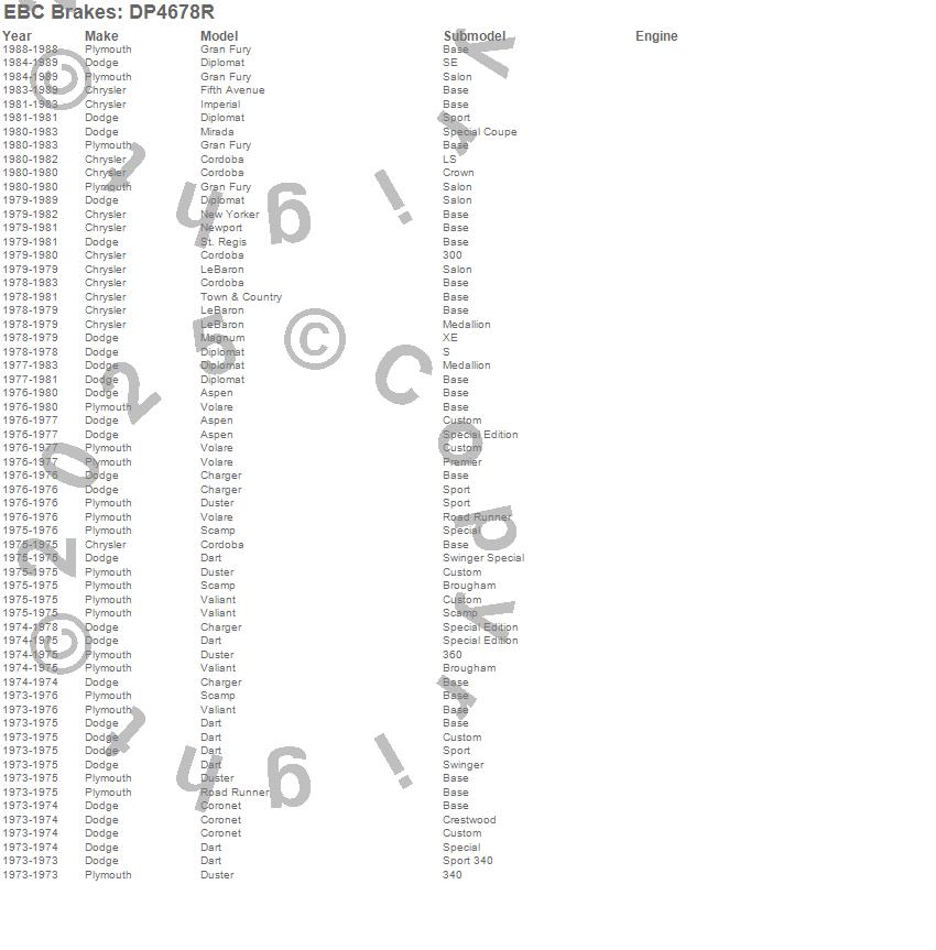 Aspen, Charger, Cordoba, Coronet, Dart, Diplomat, Duster, Fifth Avenue, Gran Fury, Imperial, LeBaron, Magnum, Mirada, New Yorker, Newport, Road Runner, Scamp, St. Regis, Town & Country, Valiant more…
