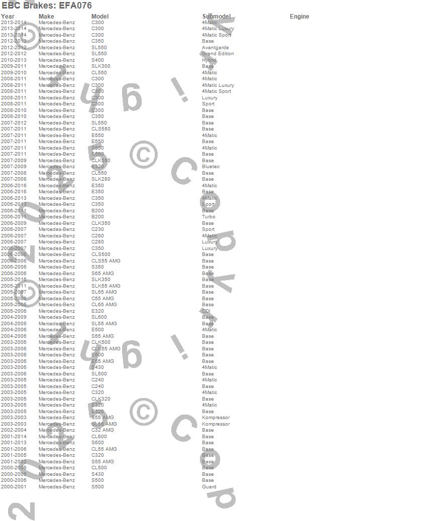 Below is an abreviated list of applications for the EBC Brake Wear Lead Sensor Kit. B200, C230, C240, C280, C300, C32 AMG, C320, C350, C55 AMG, CL500, CL55 AMG, CL550, CL600, CL65 AMG, CLK320, CLK350, CLK500, CLK55 AMG, CLK550, CLS500 more…