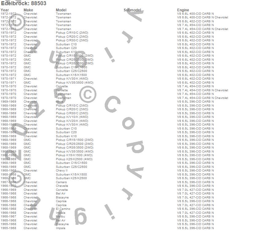 Bel Air, Biscayne, C10 Pickup, C10 Suburban, C15/C1500, C15/C1500 Suburban, C20 Pickup, C20 Suburban, C25/C2500 Pickup, C25/C2500 Suburban, C30 Pickup, C35/C3500 Pickup, Camaro, Caprice, Chevelle, Chevy II, Corvette, Impala, K10 Pickup, K10 Suburban more...