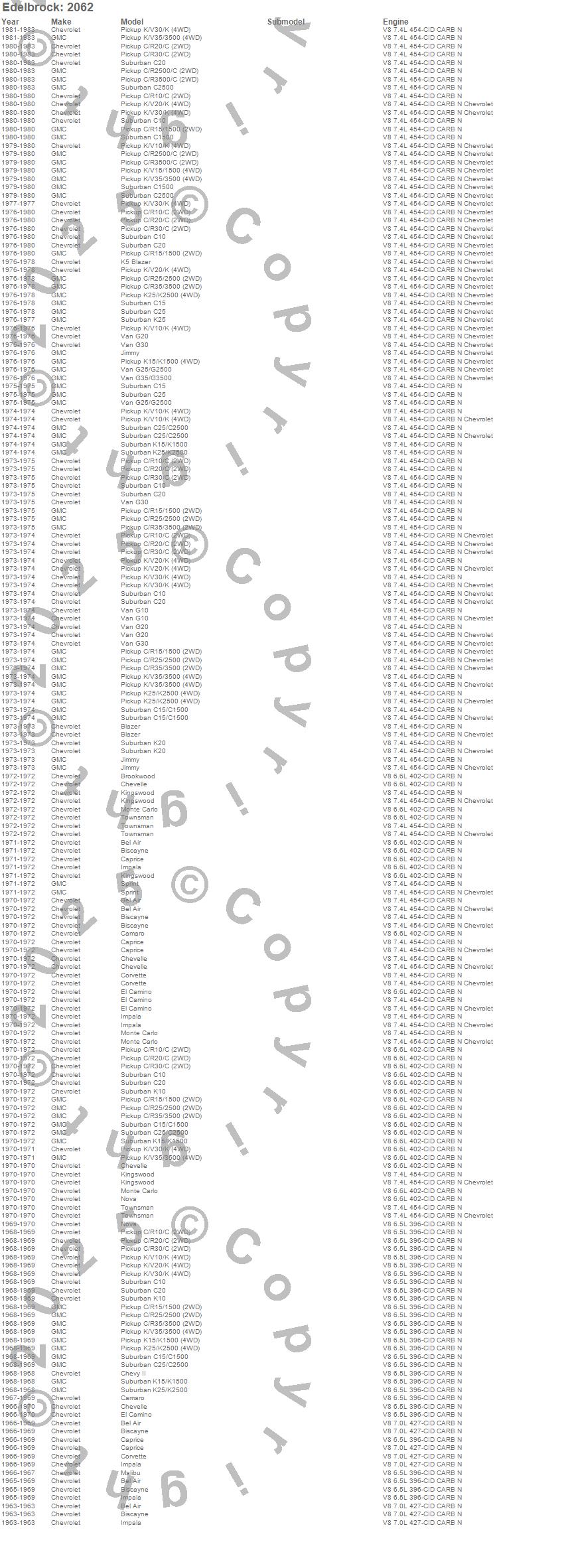 Bel Air, Biscayne, Blazer, Blazer K5, Brookwood, C10 Pickup, C10 Suburban, C15 Suburban, C15/C1500, C15/C1500 Suburban, C1500, C1500 Suburban, C20 Pickup, C20 Suburban, C25 Suburban, C25/C2500 Pickup, C25/C2500 Suburban, C2500 Pickup, C2500 Suburban, C30 Pickup more...