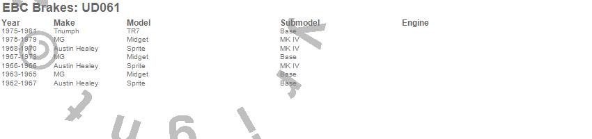 Below is an abreviated list of applications for the EBC Ultimax OEM Replacement Brake Pads. Midget, Sprite, TR7, Austin Healey, MG, Triumph, 1981, 1980, 1979, 1978, 1977, 1976, 1975, 1973, 1972, 1971, 1970, 1969, 1968, 1967 more…